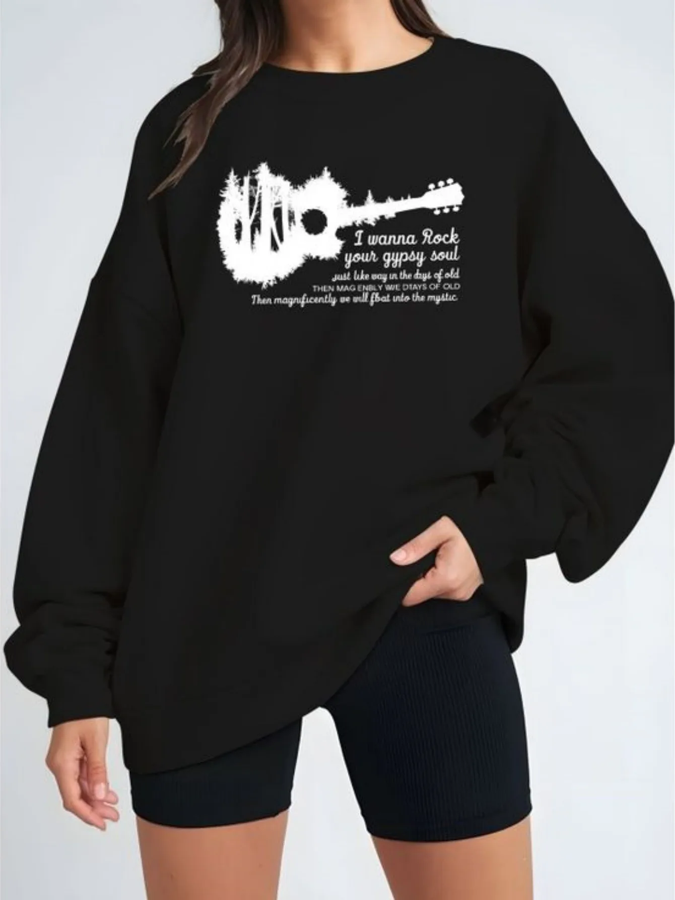 Women’s Rock Guitar Graphic Crew Neck Sweatshirt – Black Casual Pullover.